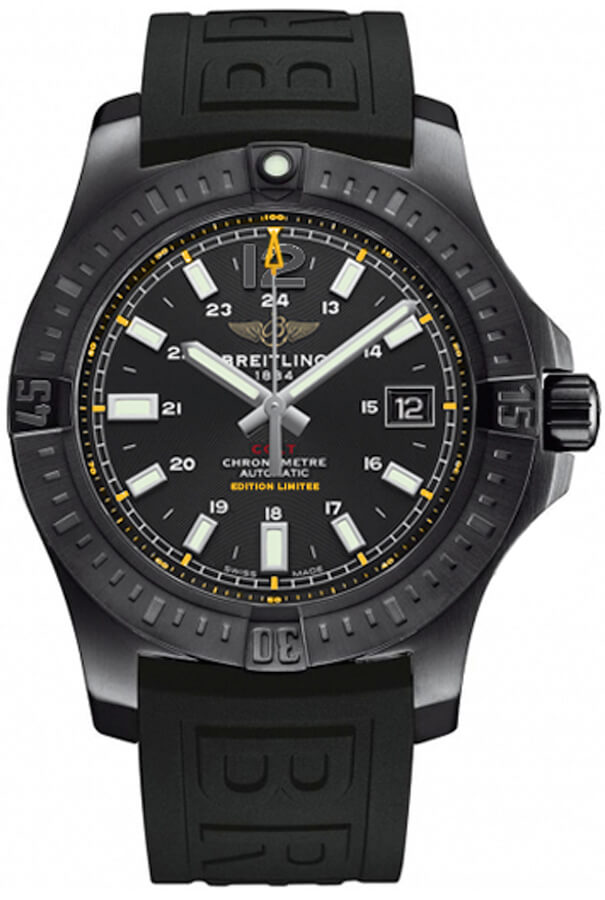 Breitling Colt 44mm Limited Edition M173881A/BG03-153S men’s watch. Limited Edition, Numbered out of 100 ever made. Features a brushed black steel case and black Dive Pro III rubber strap. Brushed black steel unidirectional rotating bezel. Black dial with luminescent hands and index hour markers. Date displayed in dial aperture at 3 o’clock. Powered by an automatic self-winding COSC Chronometer certified movement. A scratch resistant sapphire crystal glareproofed on both sides protects the dial. The case is round and 44mm in diameter. Inlet size: 22mm. Screw down crown and case back. Black steel deployment buckle. Water resistant to 200 meters / 660 feet. Functions: hours, minutes, seconds, date. Sport watch style. Swiss made.