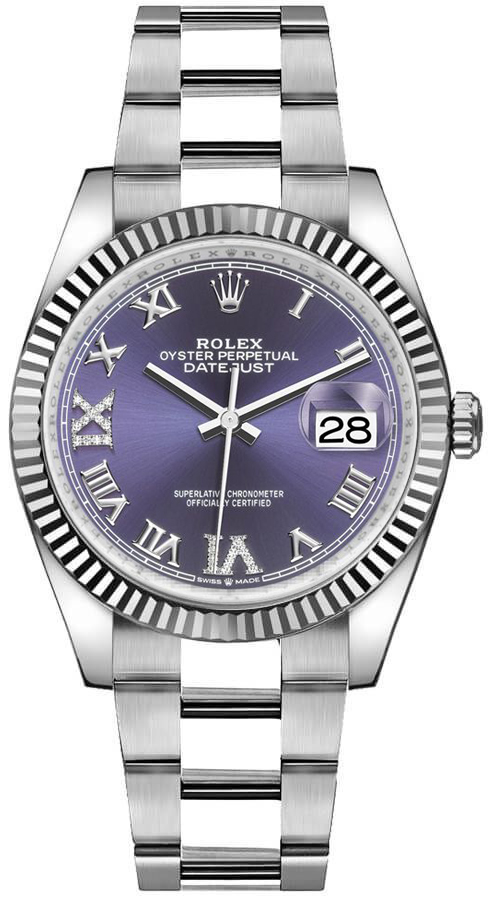 The Rolex Datejust 36 is an iconic watch that epitomizes luxury and style. This particular model features an aubergine purple dial with roman numeral hour markers including diamonds set on the VI and IX, and a date window displayed at 3 o’clock. The 36mm case is made of stainless steel, topped with an 18k white gold fluted bezel, and houses a chronometer-certified automatic movement with a 70-hour power reserve. The watch is completed with an oyster bracelet and an oysterclasp deployment buckle.