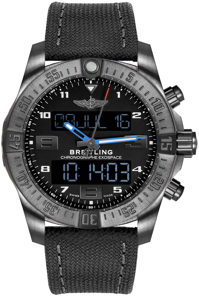 Breitling Professional Exospace B55 VB5510H2/BE45/100W men’s watch. Features a brushed black titanium case and anthracite canvas strap. Bidirectional rotating bezel. Volcano black dial with blue hands and luminescent hands, index and Arabic hour markers. Range of functions including an electronic tachymeter, a “countdown/countup” system, a “chrono flight and “chrono regatta” device for recording flight and regatta times, respectively, while memorizing departure and arrival times. Powered by the Breitling Caliber B55 which is a SuperQuartz caliber with analog and digital displays. A scratch resistant sapphire crystal glareproofed on both sides protects the dial. The case is round, 46mm in diameter and is 15.25mm thick. Inlet size: 24mm. Non screw-locked crown with 2 gaskets with integrated pushpiece. Screw down case back. Tang buckle. Water resistant to 100 meters / 330 feet. Functions: hours, minutes, calendar, alarm, chronograph. Sport watch style. Swiss made.