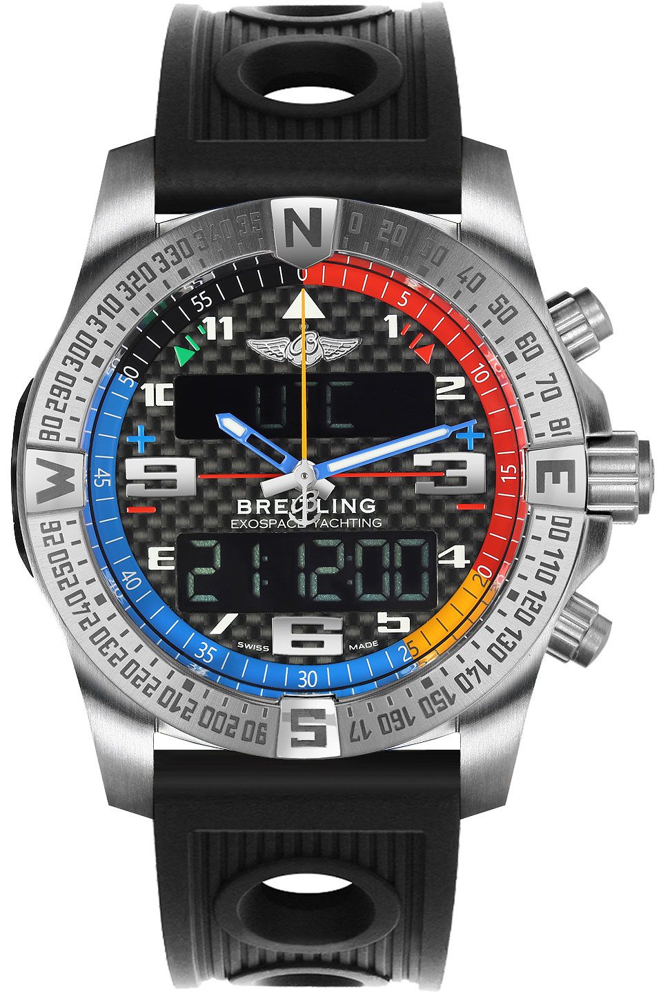 Breitling Exospace B55 Yachting EB551222/BG45/201S/E20D.2 men’s watch. Features a brushed titanium case with bidirectional rotating rider-tab bezel and a black Ocean Racer rubber strap. The Carbon dial has an analog display and an electronic 12/24hr LCD digital display with multiple functions. The hour hand, minute hand and hour markers are luminescent. Powered by the Breitling Caliber B55 SuperQuartz thermocompensated quartz electronic chronometer certified movement. A charging kit is included to recharge the battery. A scratch resistant sapphire crystal which is glareproofed on both sides protects the dial. The case is round, 46mm in diameter, weighs 80g and is 15.25mm thick. The crown is non screw-locked, has 2 gaskets and an integrated push button. The case back is screwed in. Inlet width: 24 mm. Titanium deployment buckle. Water-Resistant to 100 meters / 330 feet. Functions: hours, minutes, seconds, date, chronograph, electronic tachymeter, a “countdown/countup” system, a “chrono flight” and “chrono regatta” device for recording flight and regatta times respectively while memorizing departure and arrival times, backlighting (white light), UTC worldtime, 7 daily alarm feature, smartphone pairing capability, bluetooth technology and battery state-of-charge indicator. Sport watch style. Swiss made.