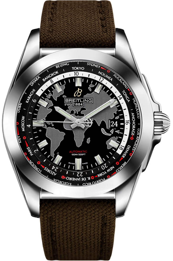 Breitling Galactic Unitime WB3510U4/BD94-108W men’s watch. Features a polished stainless steel case and brown canvas strap. Polished tungsten carbide fixed bezel. Trophy black dial with luminescent hands and index hour markers. Date window displayed at 3 o’clock. World time zone features with world city ring on dial edge. Day and night indicator. Powered by the Breitling Caliber B35 self-winding automatic COSC Chronometer certified movement which boasts a 70 hour power reserve, beats at 28,800 vph and contains 41 jewels. A scratch resistant glareproof sapphire crystal protects the dial. The case is round, 44mm in diameter and 15.3mm thick. Inlet size: 22mm. Solid case back. Screw down crown and case back. Stainless steel deployment buckle. Water resistant to 100 meters / 330 feet. Functions: hours, minutes, seconds, date, world time zone, day and night indicator. Casual watch style. Swiss made.
