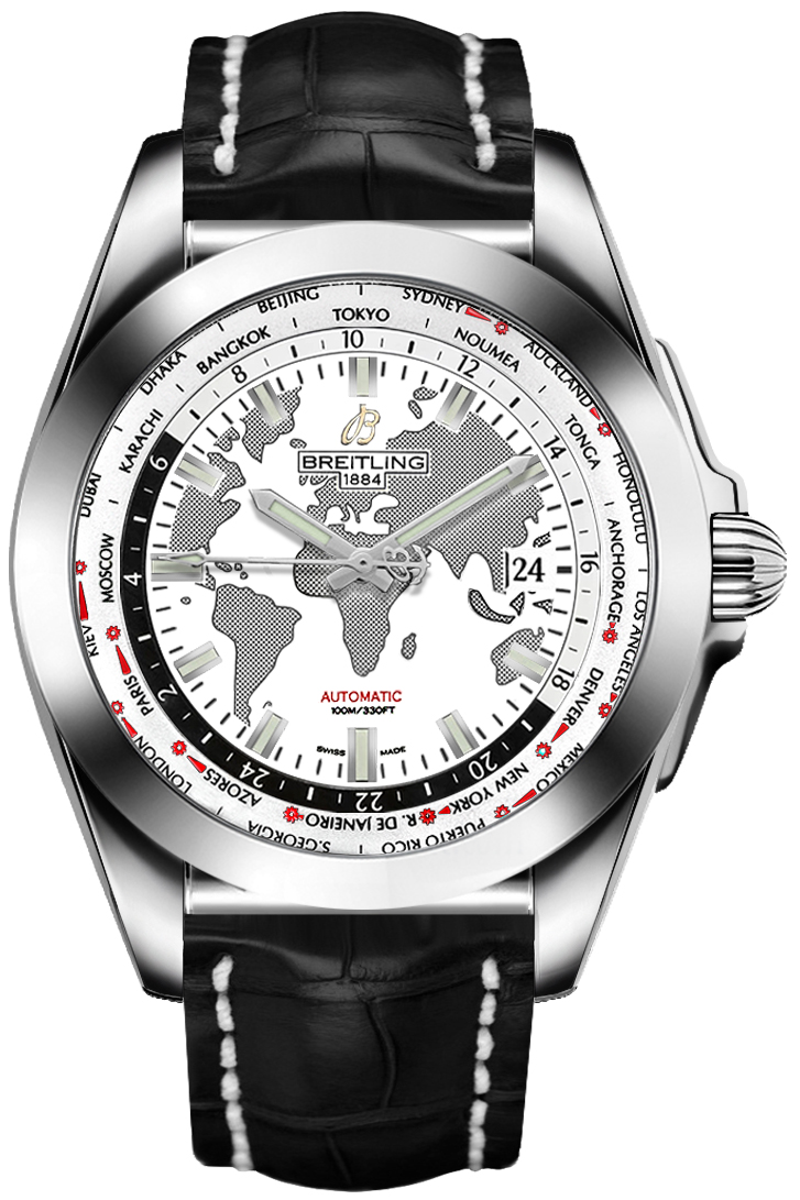 Breitling Galactic Unitime Calibre B35 WB3510U0/A777-743P men’s watch. Features a polished stainless steel case and black leather strap with pattern. Polished tungsten carbide fixed bezel. Antarctica world map white dial with luminescent hands and index hour markers. Date window displayed at 3 o’clock. World time zone feature with world city ring on dial edge. Day and night indicator. Powered by the Breitling Caliber B35 self-winding automatic COSC Chronometer certified movement which boasts a 70 hour power reserve, beats at 28,800 vph and contains 41 jewels. A scratch resistant glareproof sapphire crystal protects the dial. The case is round, 44mm in diameter and 15.3mm thick. Inlet size: 22mm. Solid case back. Screw down crown and case back. Stainless steel tang buckle. Water resistant to 100 meters / 330 feet. Functions: hours, minutes, seconds, date, world time zone, day and night indicator. Casual watch style. Swiss made.