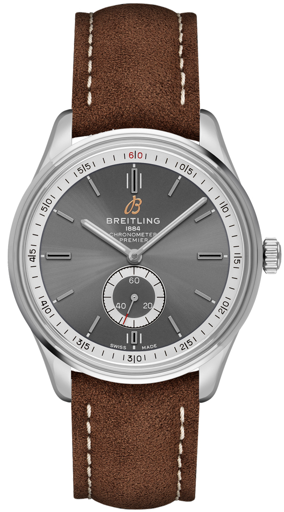 Breitling Premier Automatic 40 A37340351B1X2 men’s watch. Features a polished stainless steel case and brown nubuck leather strap. Polished stainless steel fixed bezel. Anthracite grey dial with luminescent hour hand, minute hand and markers. Index hour markers. Small seconds sub-dial at 6 o’clock. Powered by the Breitling Caliber 37 self-winding automatic COSC Chronometer certified movement which boasts a 38 hour power reserve and beats at 28,800 vph. A cambered, scratch resistant sapphire crystal glareproofed on both sides protects the dial. The case is round, 40mm in diameter and 11.40mm thick. Inlet size: 20mm. Non screw-locked crown with 2 gaskets. Screw down case back. Stainless steel tang buckle. Water resistant to 100 meters / 330 feet. Functions: hours, minutes, small seconds. Dress watch style. Swiss made.