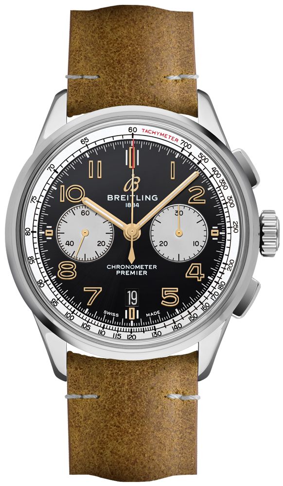 Breitling Premier B01 Chronograph 42 Norton Edition AB0118A21B1X2 men’s watch. Limited production. Features a polished stainless steel case and brown leather strap. Polished stainless steel fixed bezel. Black dial with white subdials and luminescent hands, Arabic numerals and index hour markers. Date displayed in dial aperture at 6 o’clock. Chronograph with large central chronograph seconds hand and 30 minute counter sub-dial at 3 o’clock. Small seconds sub-dial at 9 o’clock. Tachymeter scale feature. Powered by the Breitling Caliber 01 self-winding automatic COSC Chronometer certified movement which boasts a 70 hour power reserve, beats at 28,800 vph and contains 41 jewels. A cambered scratch resistant sapphire crystal glareproofed on both sides protects the dial. The case is round, 42mm in diameter, weighs 100g and is 13.65mm thick. Inlet size: 22mm. Sapphire crystal exhibition case back. Non screw-locked crown with 2 gaskets. Screw down case back. Stainless steel tang buckle. Water resistant to 100 meters / 330 feet. Functions: hours, minutes, small seconds, date, chronograph, tachymeter scale. Sport watch style. Swiss made.