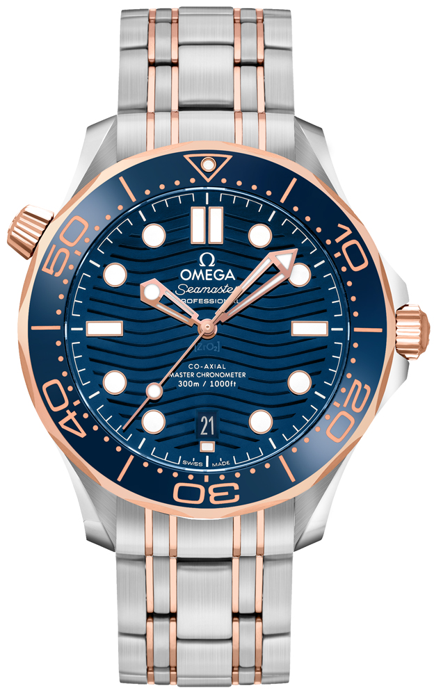 OMEGA Seamaster self-winding automatic co-axial 210.20.42.20.03.002 men’s watch. Round brushed with polished stainless steel case on a brushed stainless steel with 18k rose gold bracelet. Blue ceramic dial with a laser-engraved wave pattern. White Super-LumiNova filled luminescent 18k rose gold index and dot hour markers and skeleton hands. Unidirectional rotating blue ceramic bezel with 18k rose gold diving scale. Date feature located at 6 o’clock. Helium escape valve with conical design located at 10 o’clock. Powered by the Omega caliber 8800 Self-winding Automatic Movement with an anti-magnetic feature and co-axial escapement which boasts a 55 hour power reserve. Total vibrations per hour: 25,200. Total jewels: 35. Domed scratch resistant sapphire crystal with anti-reflective treatment on both sides. Inlet size of 20mm. Sapphire crystal exhibition case back. Screw down crown. Stainless steel deployment buckle. Water-resistant to 300 meters / 1000 feet. Functions: hours, minutes, seconds, date. Diving watch style. Swiss made.
