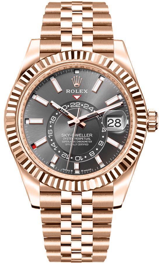 Presenting the Rolex Sky-Dweller 336935-0008, a timepiece of exquisite craftsmanship and unparalleled precision. Featuring a sophisticated slate dial adorned with index hour markers, this watch boasts a range of impressive features including a date display, GMT second time zone function, and a 42mm 18k Everose gold case. The rotating Ring Command fluted bezel adds a touch of elegance, while the jubilee bracelet with a folding Oysterclasp ensures a comfortable and secure fit. Powered by an automatic movement certified as a chronometer, the Rolex Sky-Dweller 336935-0008 is a true testament to luxury and style.