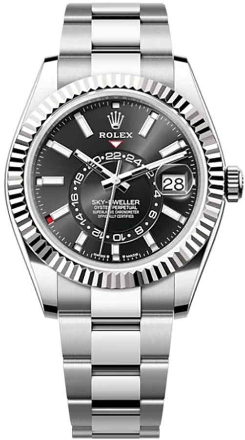 The Rolex Sky-Dweller 336934-0007 is an exquisite luxury timepiece, embodying the perfect blend of performance, style and sophistication. This watch features a black dial with index hour markers, a 24-hour GMT second time zone and an annual calendar for tracking date changes. Its 42mm stainless steel case is complemented by an 18k white gold fluted bezel, while the Oyster bracelet and Oysterclasp ensure maximum comfort when wearing it. Powered by an automatic chronometer-certified movement, this watch will securely keep you on time wherever you may go.