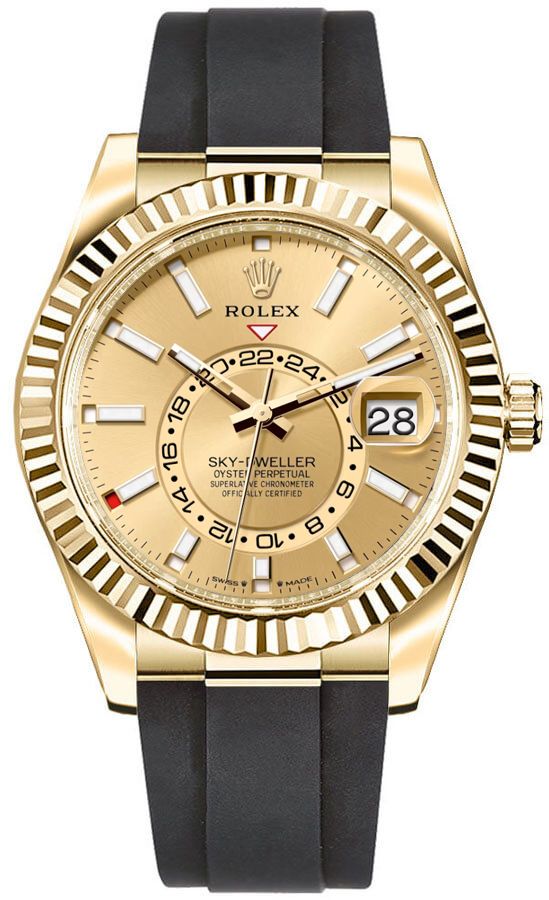 Experience the exquisite craftsmanship and timeless elegance of the Rolex Sky-Dweller 336238-0001. This luxurious timepiece features a champagne dial adorned with index hour markers, a date display, and a GMT second time zone function for ultimate convenience. The 42mm case is crafted from 18k yellow gold and showcases a bidirectional rotating Ring Command fluted bezel, adding a touch of sophistication to the design. The watch is complemented by a black Oysterflex bracelet and a folding Oysterclasp for a secure and comfortable fit. Powered by an automatic movement, this chronometer-certified watch is a true symbol of precision and refinement.