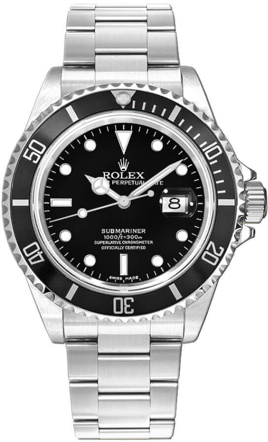 Rolex Submariner Date men’s vintage watch 16800. This 40mm watch features a 904L stainless steel oystersteel case and Oyster bracelet. The black dial has luminous hour markers with a date window displayed under a cyclops lens at 3 o’clock. It is powered by the Rolex Caliber 3035 self-winding automatic COSC Superlative Chronometer certified movement with a 48 hour power reserve.