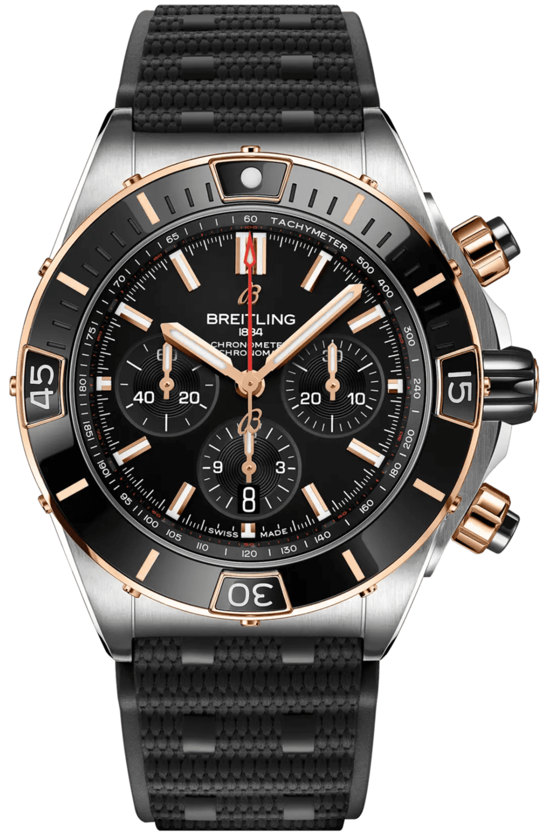Experience the epitome of luxury and precision with the Breitling Super Chronomat B01 44 UB0136251B1S1. This 44mm timepiece is housed in a meticulously crafted stainless steel and 18k rose gold case with a sleek black ceramic bezel, combining bold design with refined craftsmanship. A striking black dial complemented by index hour markers and a convenient date display is enhanced by a chronograph function that adds a touch of functionality. Powered by an automatic movement and certified as a chronometer, this watch is a true testament to Breitling’s commitment to excellence. The black rubber strap ensures a comfortable fit, while the folding clasp (A20DSA.6 / A20D6) provides security and ease of wear.