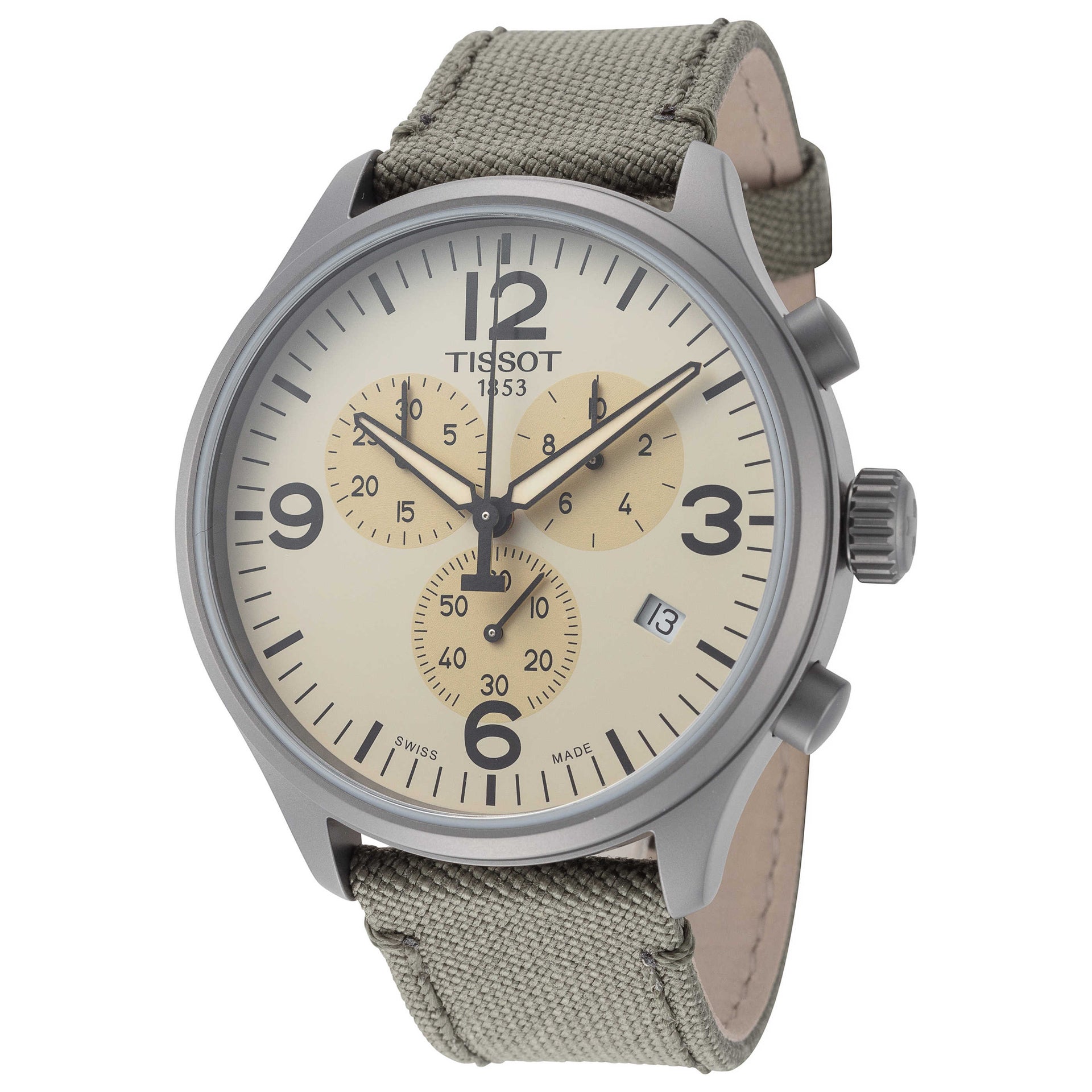 Presenting the Tissot Chrono XL, a sophisticated Swiss-made men’s watch that combines style with functionality. This quartz movement timepiece boasts a round 45mm stainless steel case with a beige dial under a scratch-resistant sapphire crystal. With its pull and push crown and closed back, it ensures superior durability, supported by a robust 100m water resistance. The Chrono XL includes a convenient date display at 4 o’clock and chronograph feature for precision timekeeping. The green fabric strap complements the design perfectly and ensures a secure fit with a pin buckle. Made for the modern man, this watch from the esteemed Tissot brand is truly exceptional. T1166173726700