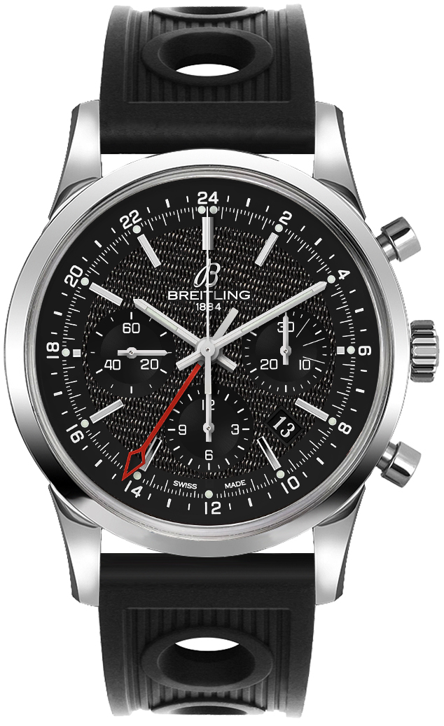 Breitling Transocean Chronograph GMT AB045112/BC67-200S Mens Watch. Features a polished stainless steel case and a fixed bezel with a black Breitling Ocean Racer rubber strap The index hour markers and hour and minute hands are luminescent. Dial type is analog. Dial color is Black. The date window is displayed between 4 and 5 o’clock. Powered by the Breitling Caliber 04 self-winding automatic chronometer certified movement which boasts a 40 hour power reserve, beats at 28,800 vph and contains 47 jewels. Has a scratch resistant sapphire crystal protecting the dial which is glareproofed on both sides. The case is round, 43mm in diameter, weighs 101.80g and is 15.75mm thick. This timepiece has a GMT Second Time zone feature and a 70 hour power reserve. Inlet width: 22 mm. Stainless steel deployment buckle. Water-Resistant to 100 meters / 330 feet. Functions: hours, minutes, seconds, date. Sports watch style. Swiss Made.